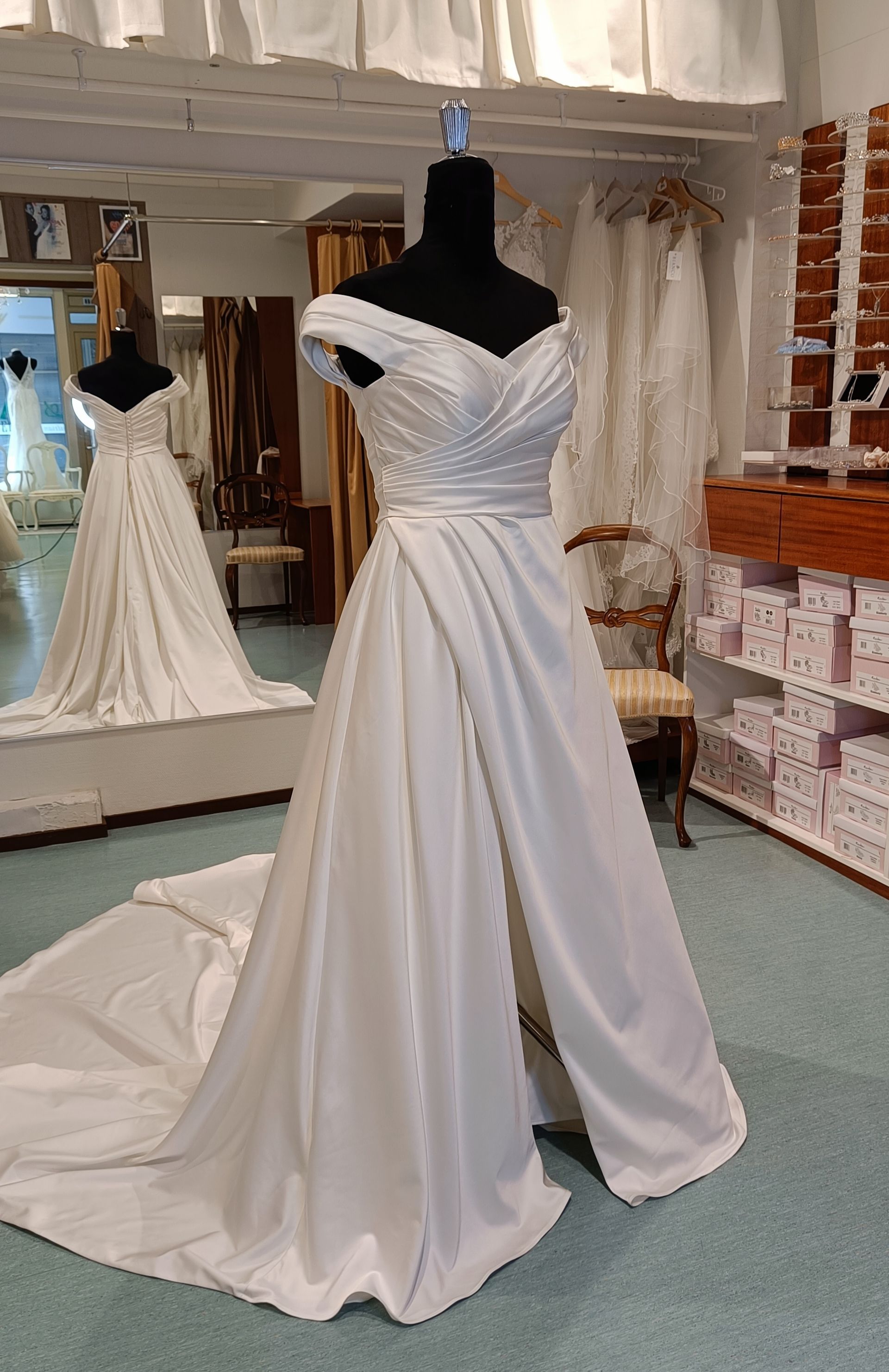 Satiinihääpuku Ekaterina halkiolla ja off shoulder pääntiellä ! Koko niukka 40. Helmaa ei ole lyhennetty. 770 €