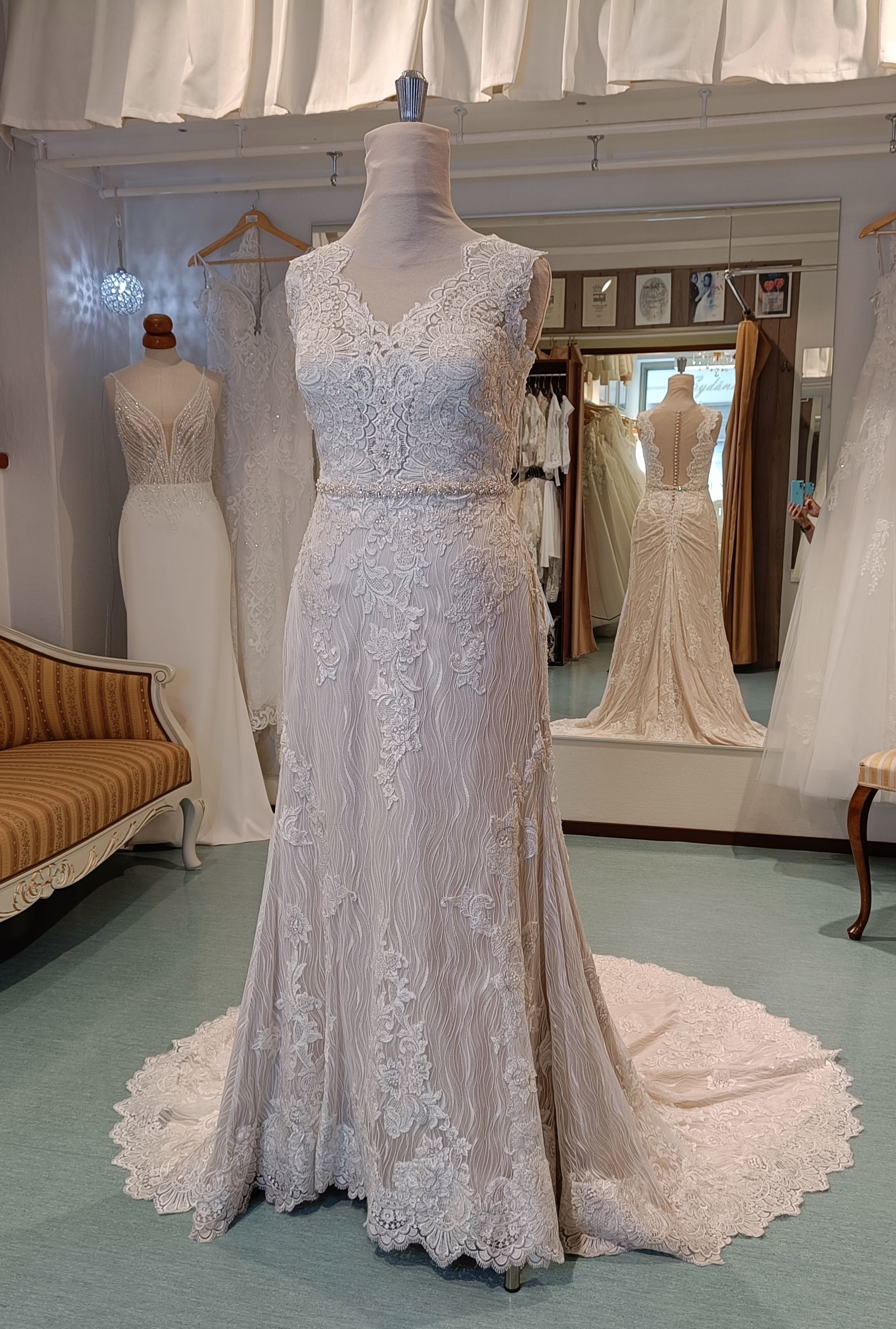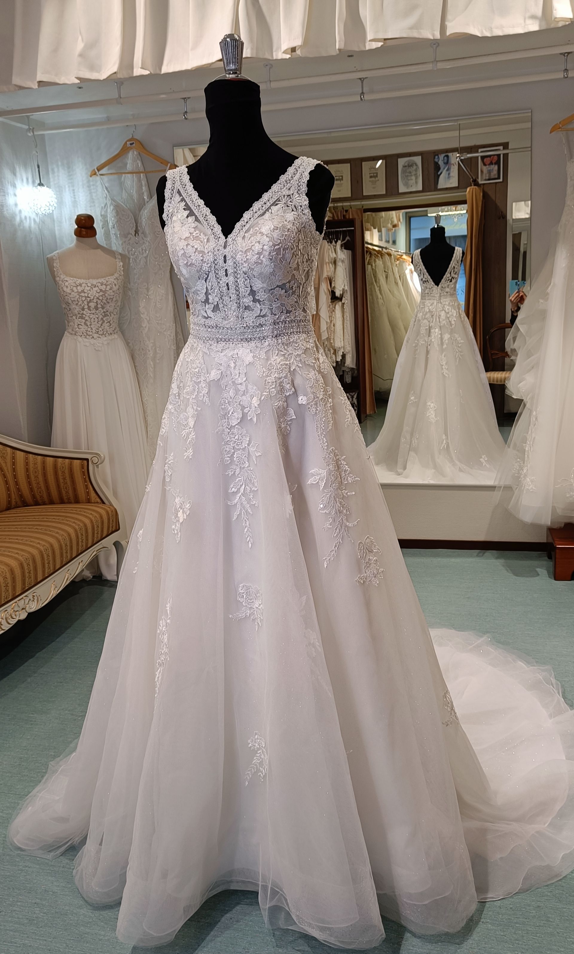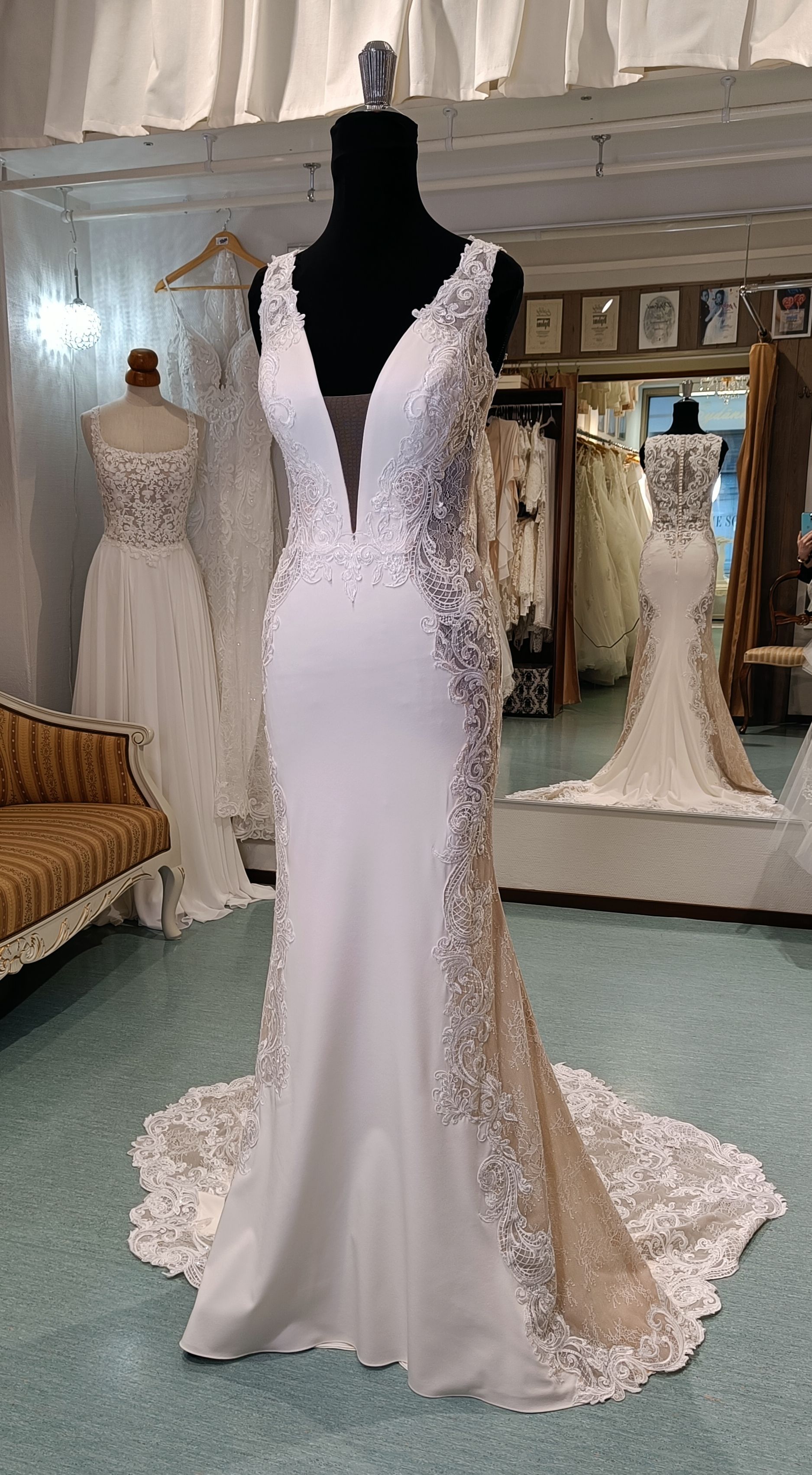Kapea A-linjainen hääpuku ! Mallikappale sävyssä ivory Ale 990 € ( 1690 € )