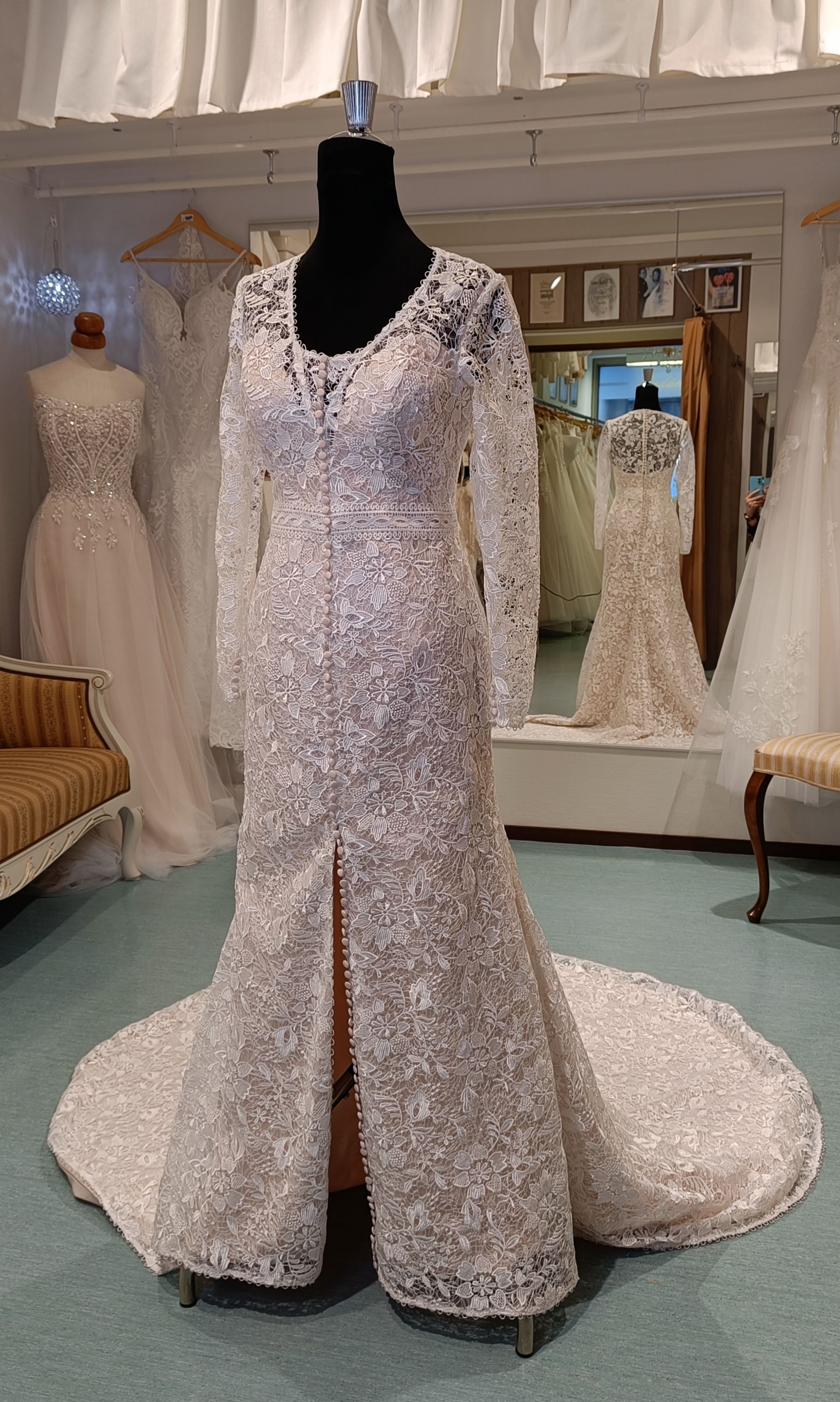 Yksilöllinen pitkähihainen hääpuku Dennison ! Puvun sävy on blush ja koko 36, pituus 160 cm. Hinta 750 € - pre loved-